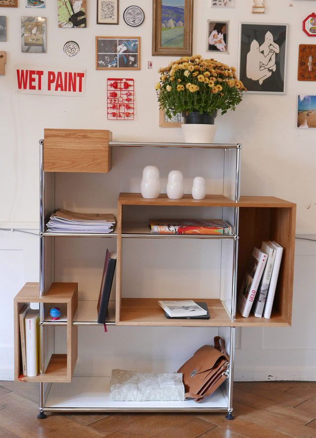 Die drei Eichenholzkisten können leicht an Regale angedockt werden und geben durch die warme Materialität dem sonst eher kühlen